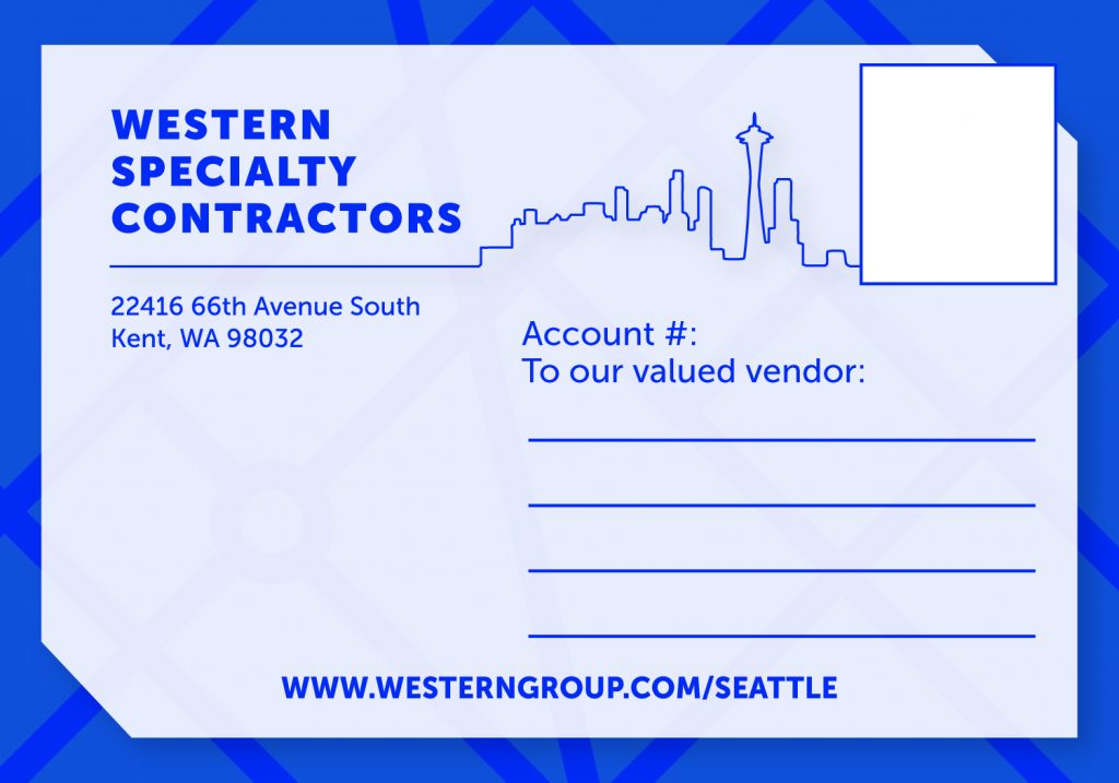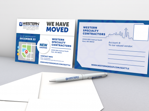 When the Seattle Branch moved they entered a Marketing Ticket to request a postcard they could mail to their vendors to announce the new location. This design can be customized for any branch and is a great example of how Marketing is available to help meet your specific needs.